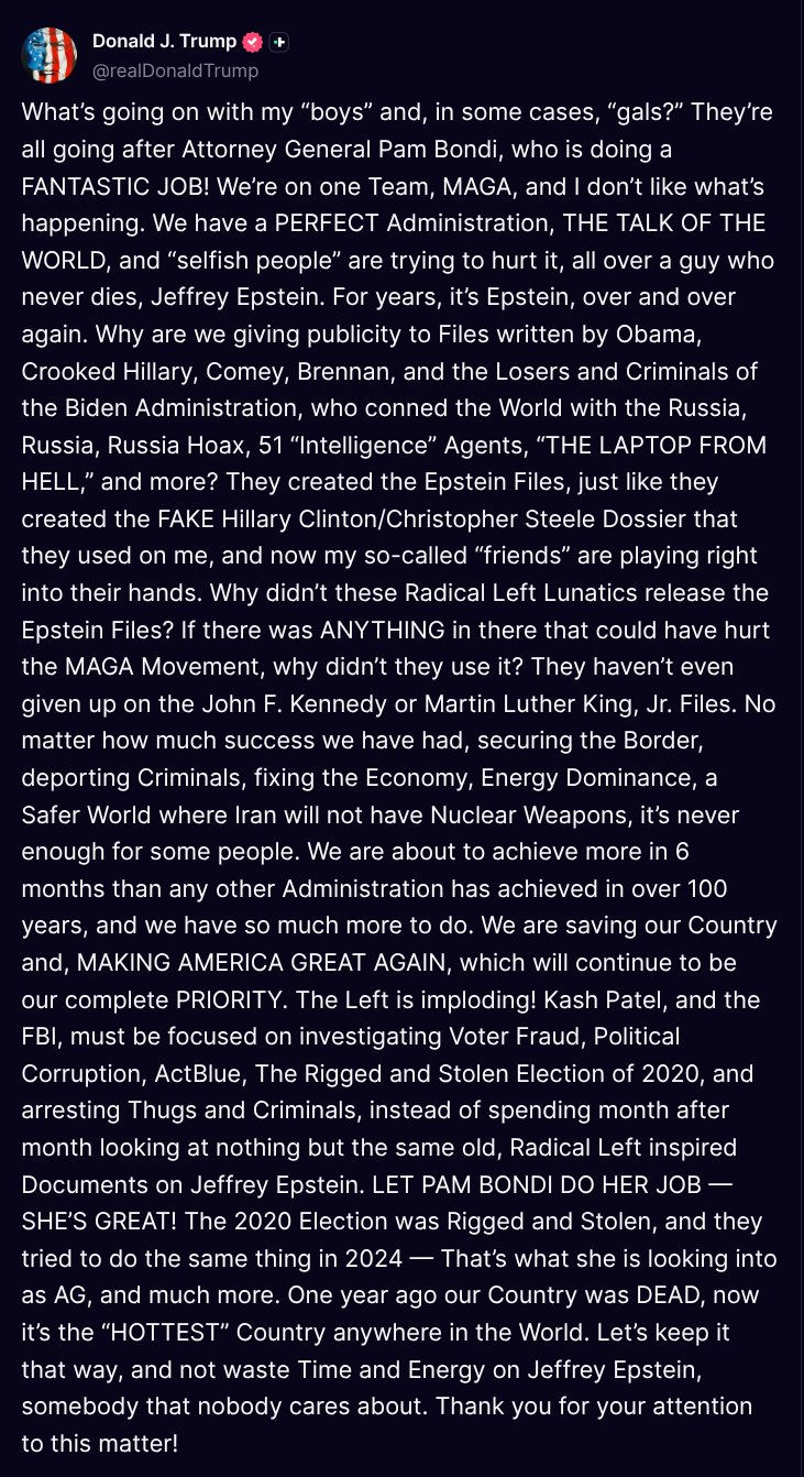Finally, Trump has never uttered a word of sympathy, empathy, or support for Epstein’s 1,000+ child sex crime victims. Yesterday, Trump claimed -- first the first time -- that the DOJ's Epstein files are "FAKE." Trump also said the person in charge of administering the Epstein coverup -- Attorney General Pam Bondi -- is doing a "FANTASTIC JOB."