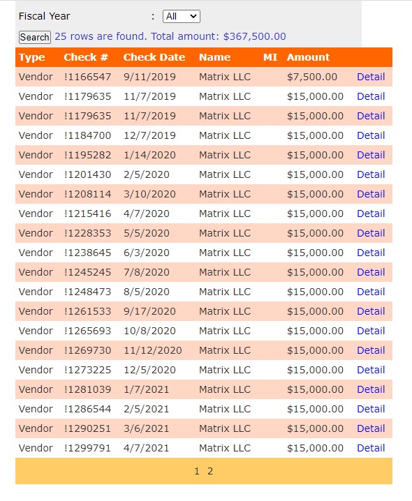 Two years later, Matrix showed up on Auburn's payroll. The company began its work on September 11, 2019 and has been paid $15,000 per month for a total of $367,500, as of September 30, 2021. The payments are for unspecified "Professional Services." They are paid from the "AU Main Campus Unrestricted" funds.
